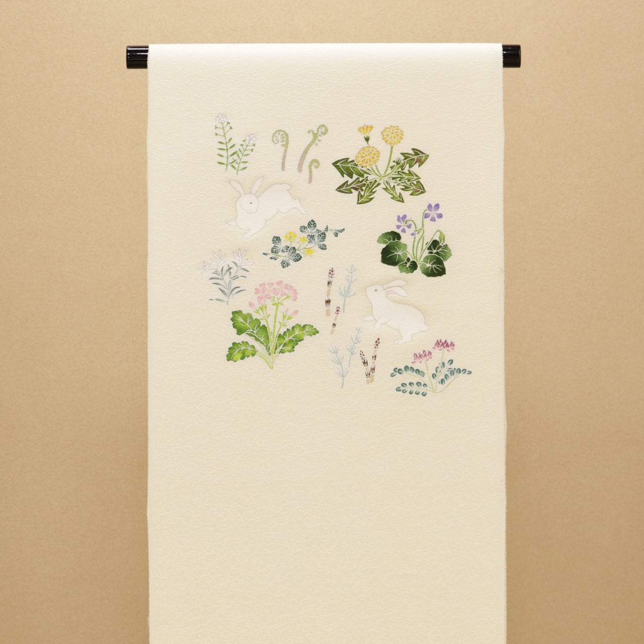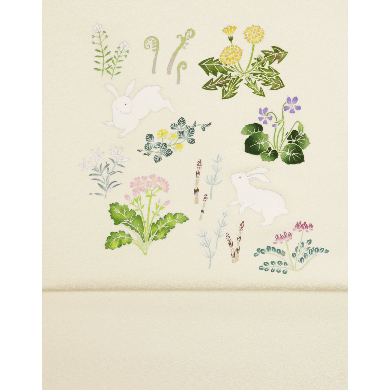銀線で仕上げたウサギは愛らしく、春草は華やかに描かれ、上品な印象を与える名古屋帯です。