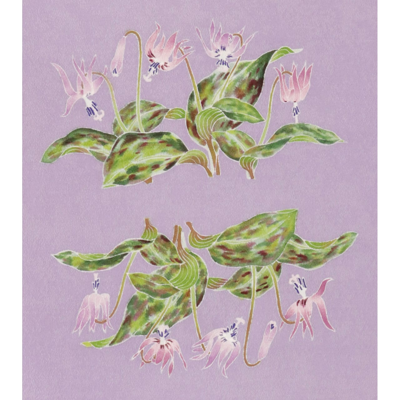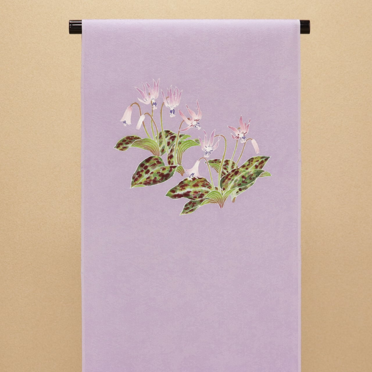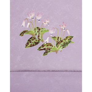 優しい藤色地に咲くかたくりの花が、春の温もりを感じさせる美しい印象です。