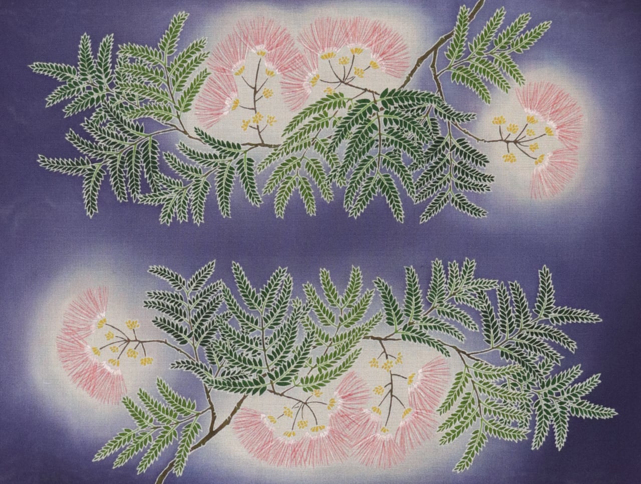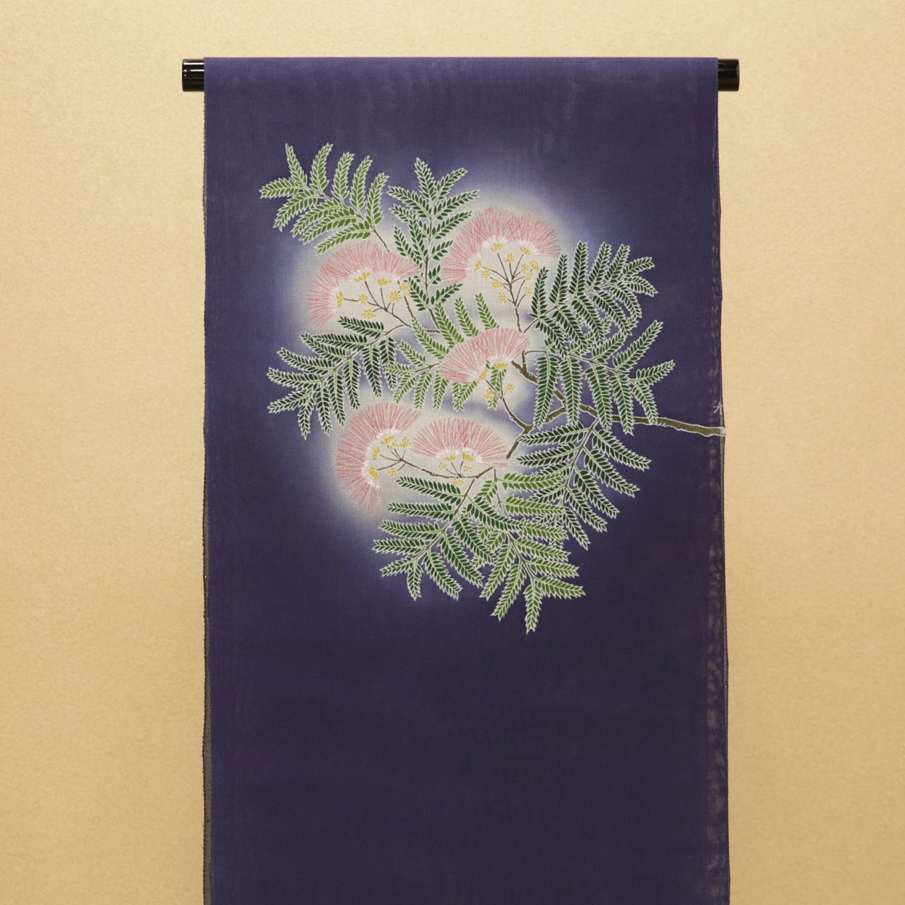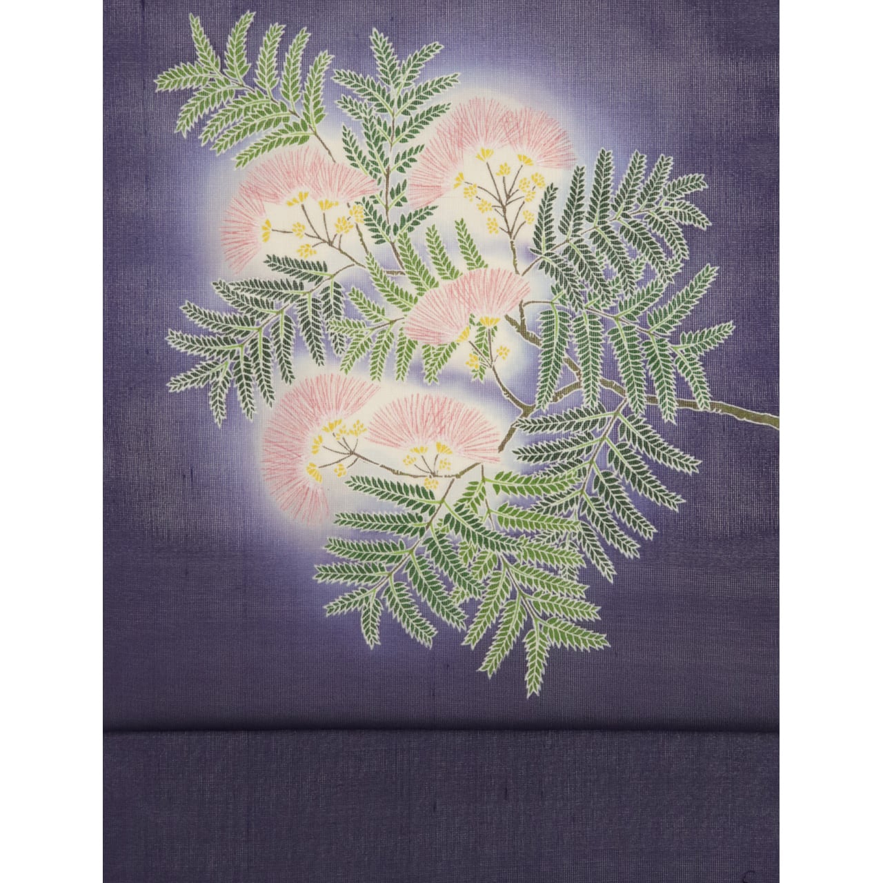 柔らかいぼかし染めの紫紺色に、ふんわりと咲く合歓の花がさわやかな印象を与え、夏の装いにぴったりです。