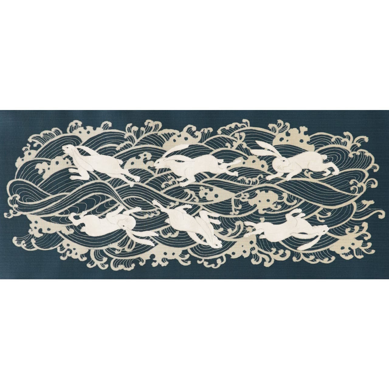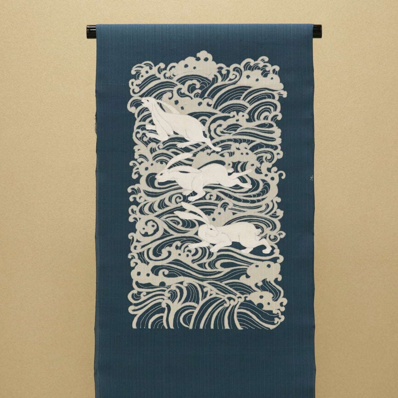 やや緑がかった中納戸の紺色に浮かぶ波と兎が、見る人に清涼感をもたらします。