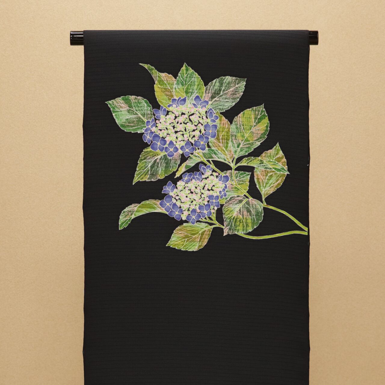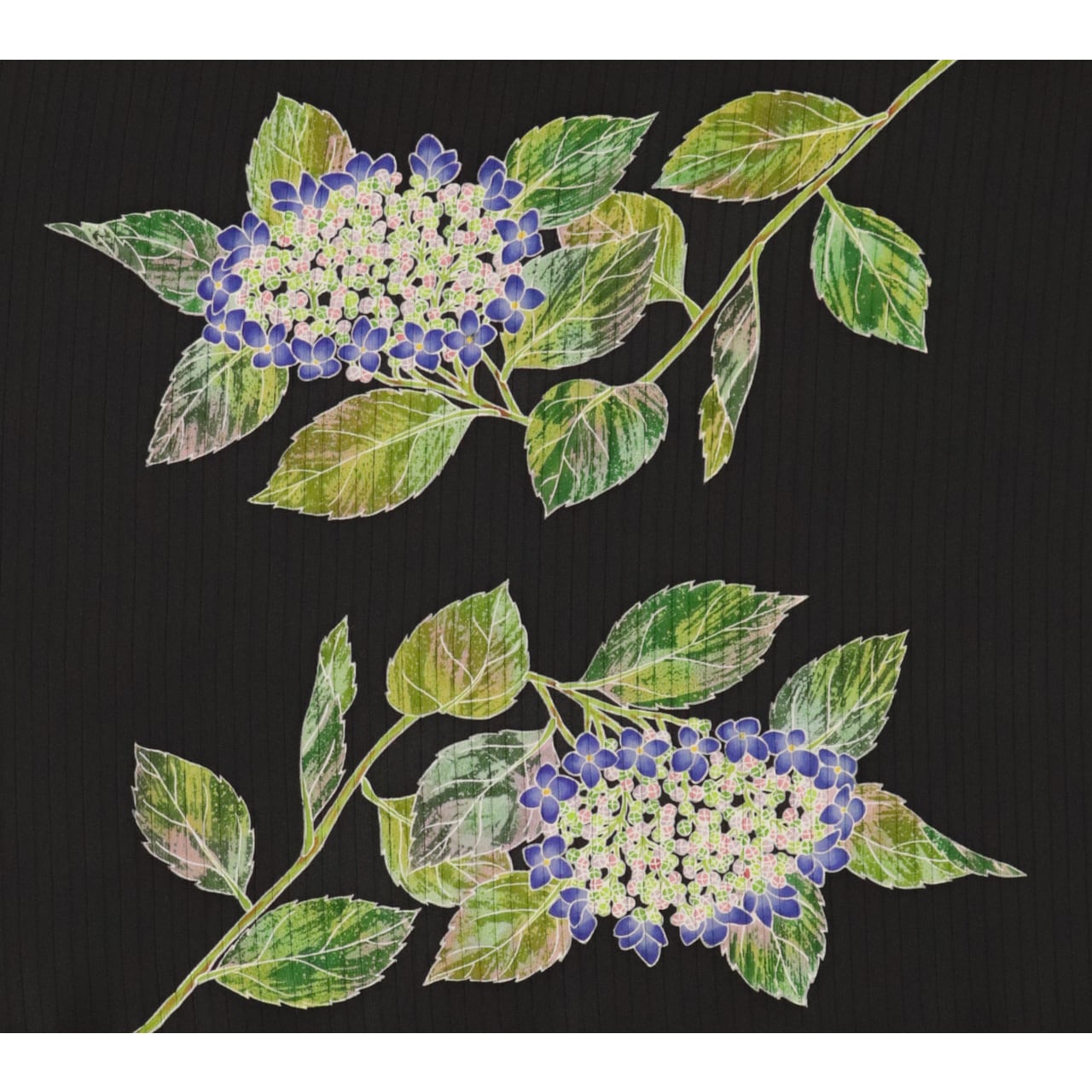 黒地に瑞々しく描かれた額紫陽花が、夏の風流な装いを一層引き立てます。