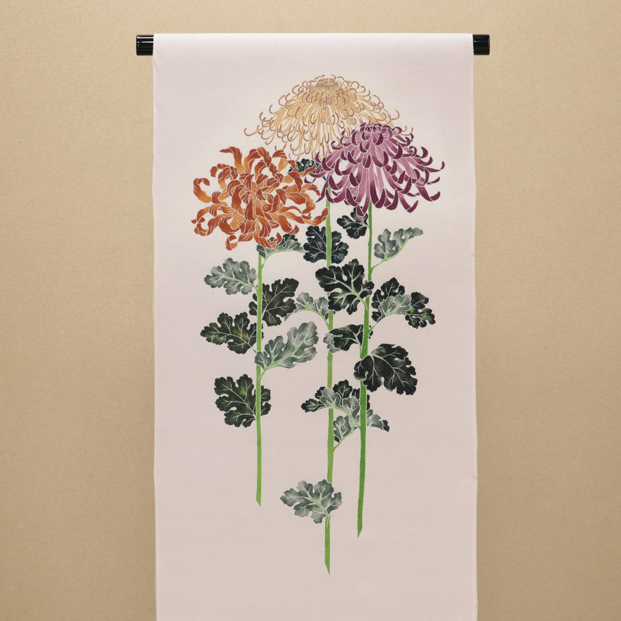 この秋帯は、乱菊を描いた手描き友禅の美しい逸品です。